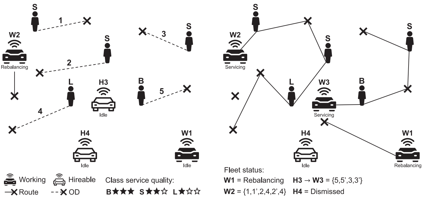 Figure 2 illustrates how a batch of requests from different SQ classes are serviced under this scenario, using a set of working and hireable vehicles. It can be seen from the output sub‑Figure 2 (b) that the high‑SQ class request B5 prompts a hiring operation (\(H3 \rightarrow W3\)) and enjoys a private ride. In contrast, the low‑SQ class request L4 waits longer to be picked up and does not travel directly to its destination (the ride is shared with user S2 momentarily). The working vehicle 2 stops rebalancing to service ODs 1, 2, and 4, whereas candidate vehicle 3 is hired to service ODs 5 and 3. Since working vehicle 1 cannot access any users in time, it repositions to the origin of the hireable vehicle 3 (presumably, an undersupplied region), whereas the idle FAV 4 is dismissed. Therefore, hireable FAVs join the working fleet to help providers honoring service quality contracts by preventing delays and rejections from happening.