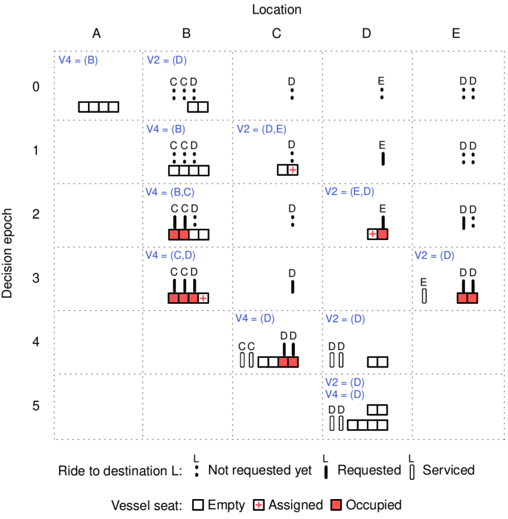 Figure 4 illustrates how an on‑demand ride‑pooling water transport system can harness anticipatory decision‑making to improve service levels. We consider two vessels, V2 and V4, of capacity two and four, respectively, operating on a one‑dimensional service area comprised of five dock locations \(l = \{A,B,C,D,E\}\). These vessels are required to service pickup‑delivery request list \(R = \{B-C,B-C,B-D,C-D,D-E,E-D,E-D\}\) appearing throughout decision epochs \(t = \{0,1,3,4,5\}\). Vessels and requests depicted across locations at each decision epoch \(t\) represent the post‑decision state of the system at \(t\), that is, the state resulting from the decisions taken based on information arriving between epochs \(t-1\) and \(t\). Each request can be represented at three stages: (i) not requested yet, (ii) requested, and (iii) serviced. Requests at stage (i) are uncertain but may be forecasted by the system. As soon as a request appears, it can be assigned to a vessel seat, therefore entering the vessel’s route plan (upper left tuple) featuring the next locations to visit.