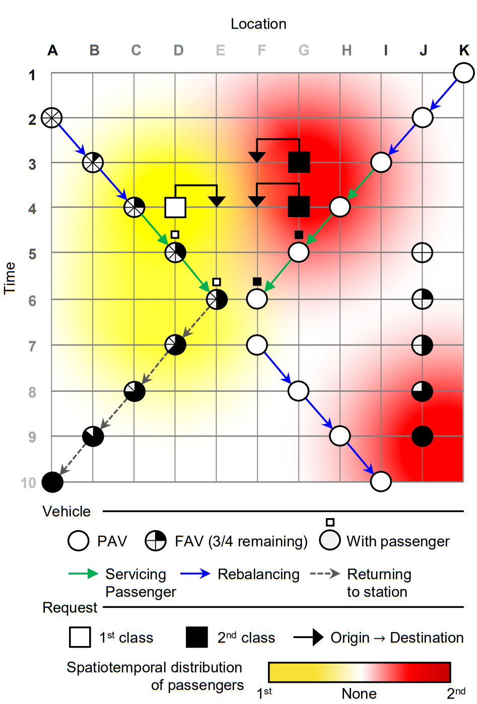 In the following, we describe the behavior of three vehicles in detail throughout ten periods. First, at time \(t = 1\), the PAV at location K is faced with two decisions; namely, it can stay in its current location or move to a more promising location in anticipation of future demand. Promising areas consist of high‑demand locations that typically generate the highest profits to the service provider. Pursuing such future profits, the PAV performs two rebalance movements, moving empty from K to J, and from J to I. Once it arrives at location I at time \(t = 3\), the PAV is assigned to a second‑class request (black square) demanding a trip from G to F (solid upper arrow). From this moment on, we consider the PAV is servicing the user, which covers both pick‑up and delivery times. Once the PAV delivers the second‑class user at F, it stays in F for one period, and then rebalances to location I, in anticipation of future passenger demand.