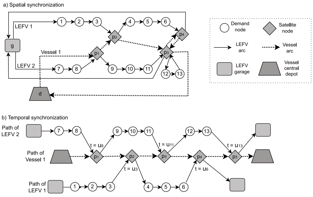 Figure 1 represents an IWLT network for pickups, multi‑trips by LEFVs, and transfers at satellites executed in synchronization by vessels and LEFVs. All sets, parameters, and decision variables are presented in Table 1.