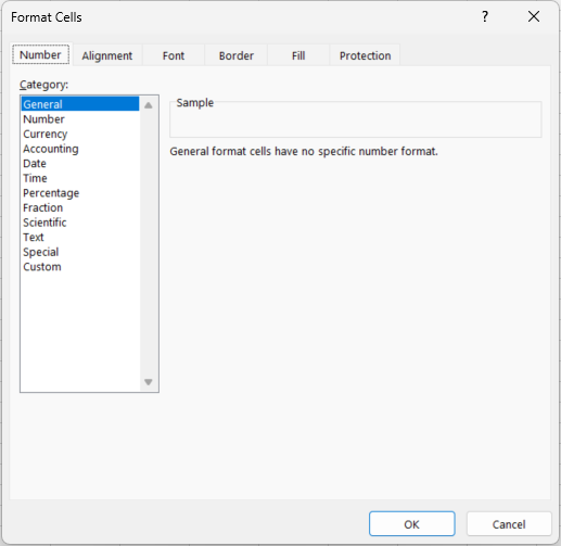 In Excel, data in cells is treated differently depending on the format assigned to the cell. You can assign this using the Format Cells menu (see figure), which you can reach by right-clicking the cell and choosing Format Cells from the menu that appears. Alternatively, press the CTRL + 1 hotkey.