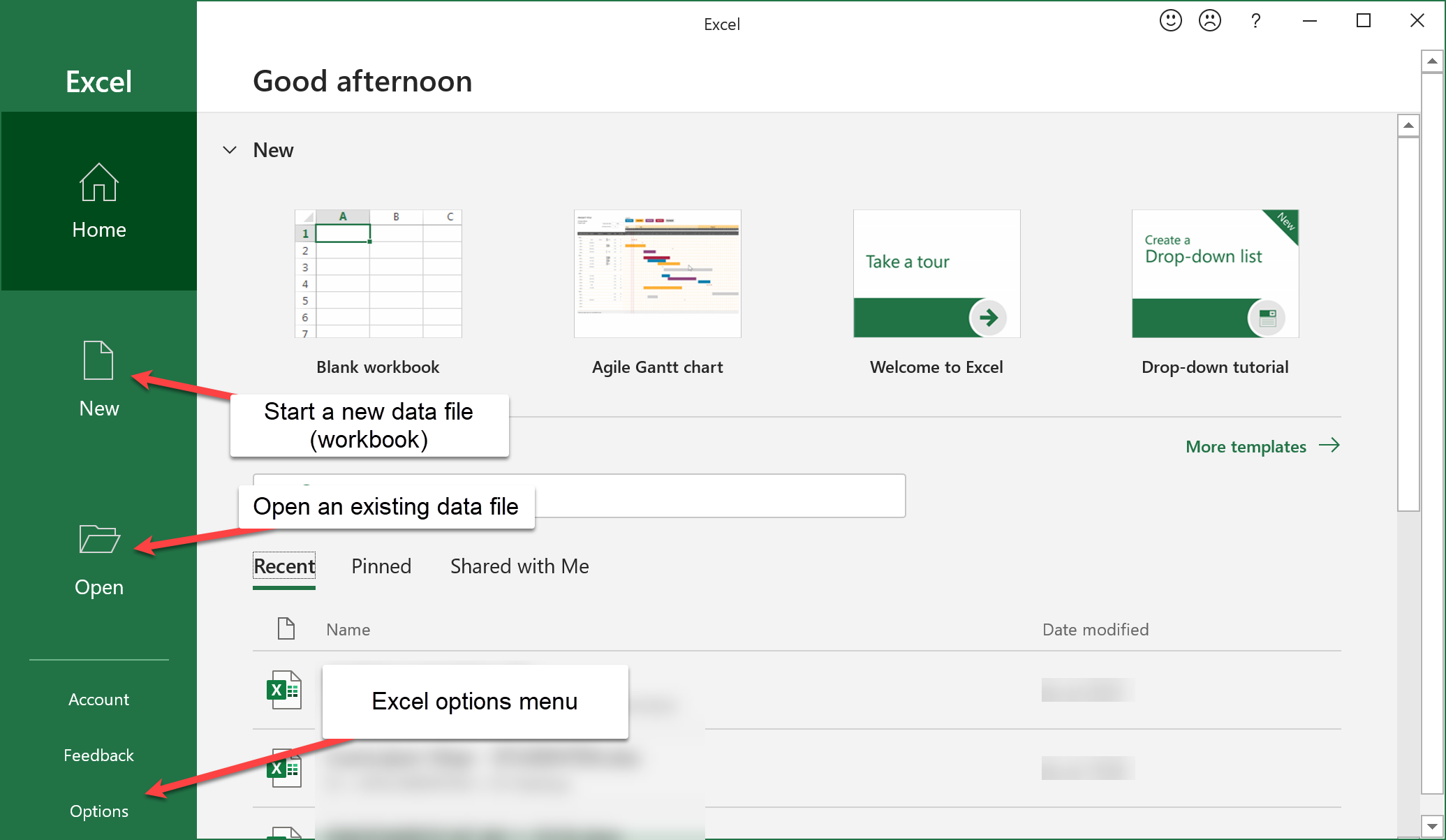 Start Excel via the Windows Start menu (press the windows key or click the windows menu button, and type “excel” to quickly find the Excel icon). After Excel has started, you see the following window, which allows you to create a new Excel data file (which is called a workbook), open an existing one, or open the Excel options menu (see below).