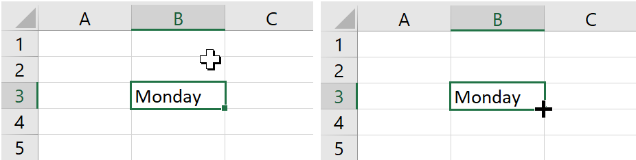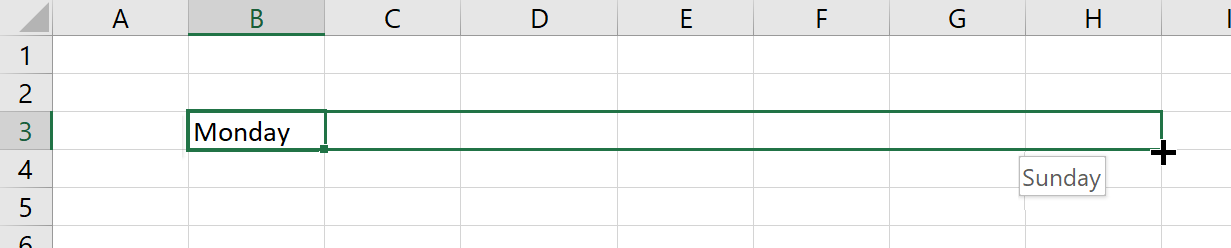 Autofill Handle After that, you can click (keep the mouse button pressed down) and drag your cursor to cell H3. Excel will now automatically fill in the correct sequence of days and you can even go beyond cell H3.