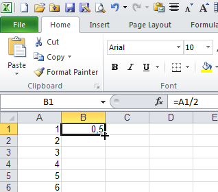 =A1/2. Double-click the black cross, like in the screenshot. You will see that Excel applies autofill to the cells B2 to B50.Delete the contents of cell A4 and B4. Put the formula