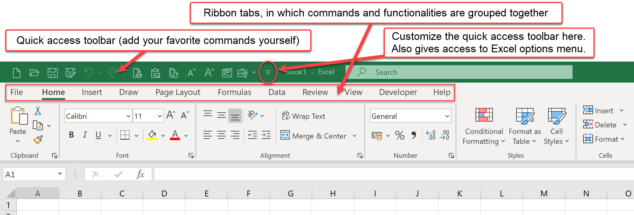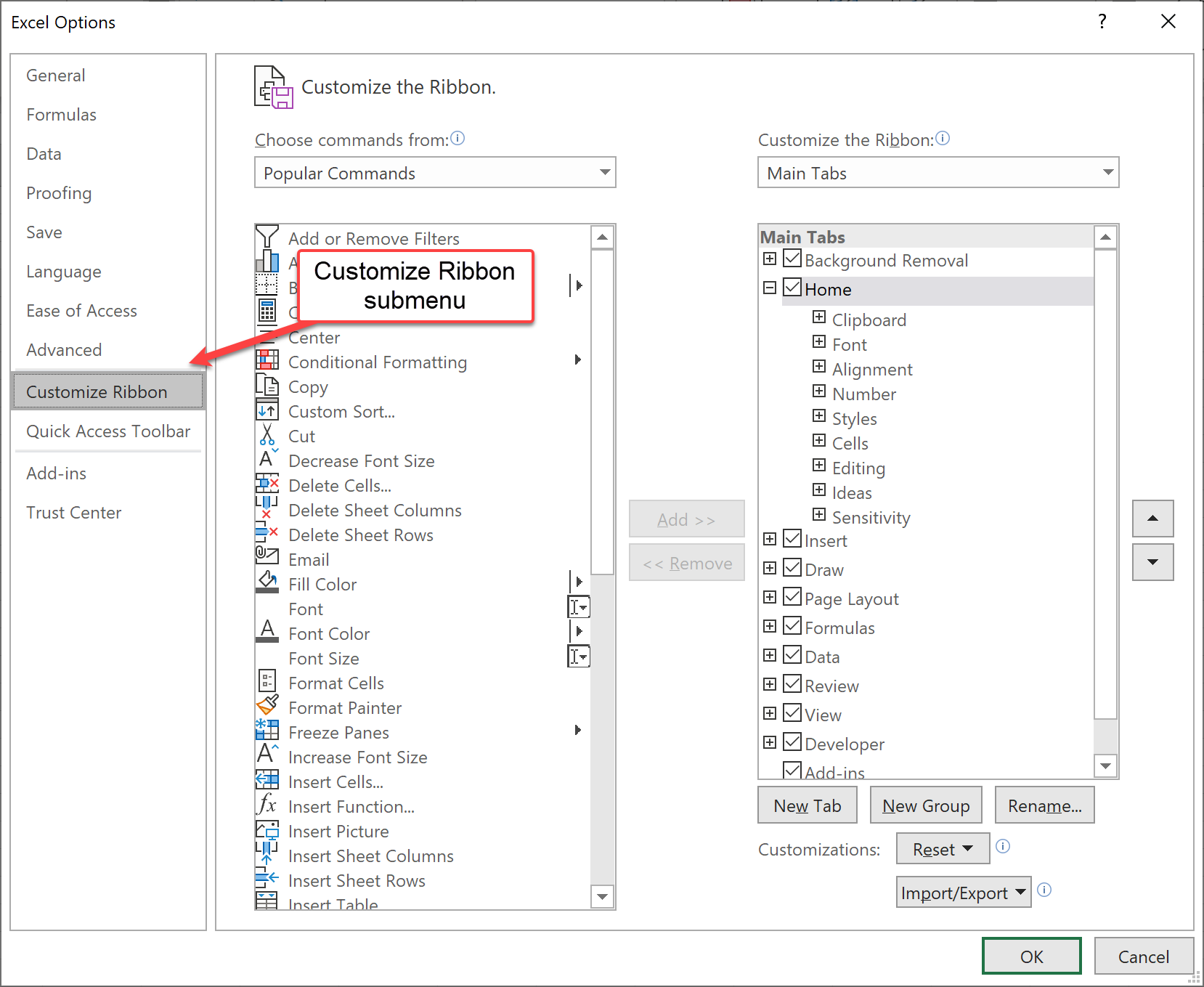You can customize the Ribbon via the Excel options menu. Within the options menu, select the Customize Ribbon submenu: