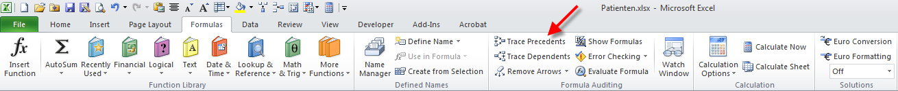 The “Formulas” tab contains functionality to build and analyze formulas. Very useful are the “trace precedents” and “trace dependents” buttons.
