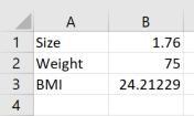 =B3(or a reference to the BMI formula). In cells H2 to H27, put the numbers 65, 66, ..., 90 again, and in the cells I1 to S1 the numbers 1.70, 1.71, ..., 1.80. Select the range H1:S27, and under “What-If Analysis” select the option Data Table. For Row Input Cell you choose$B$1(the cell with the Size), and for Column Input Cell you choose$B$2(the cell with the Weight). Press OK, and view the result.
