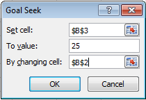 Imagine you want to know how much you should weigh to have a BMI of exactly 25. Click Goal Seek, in the Data tab, under What-If Analysis. You will get this screen: