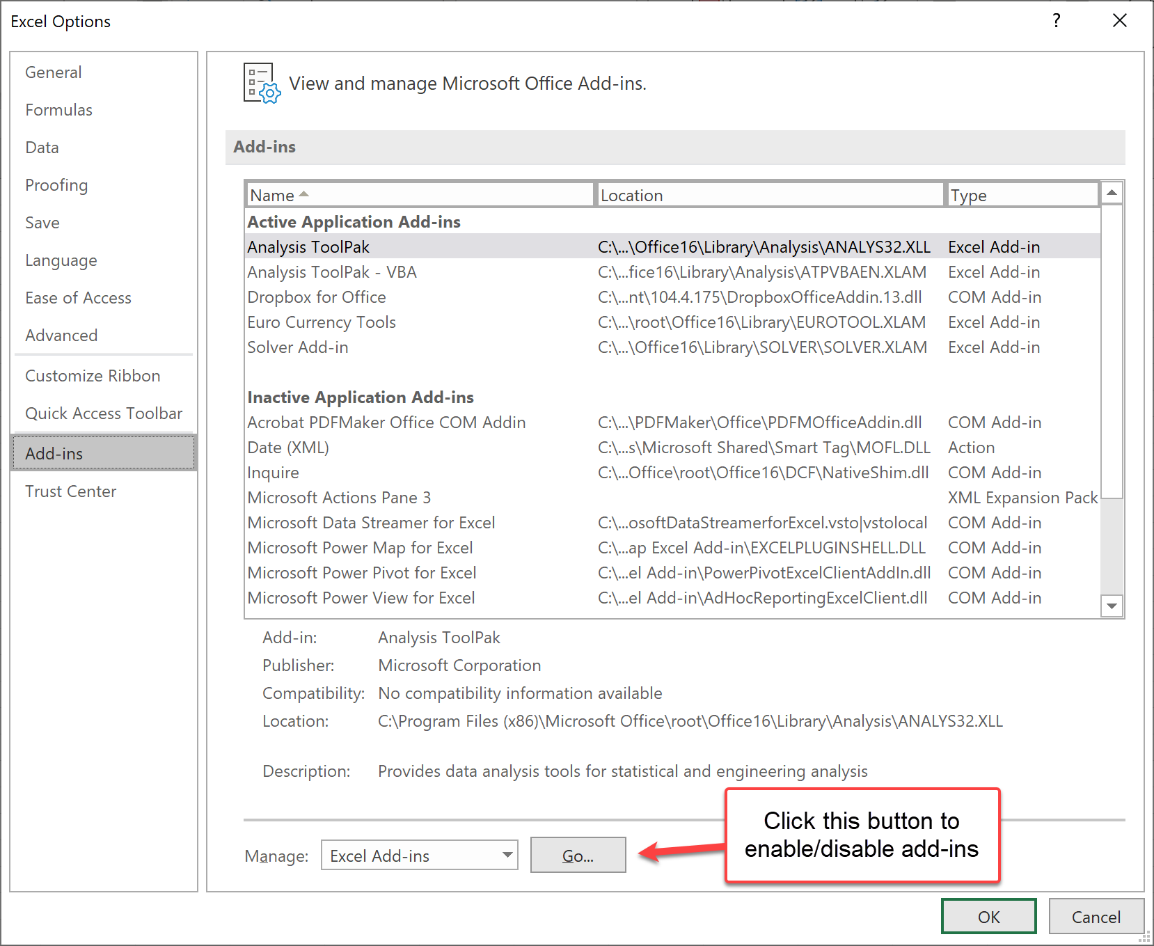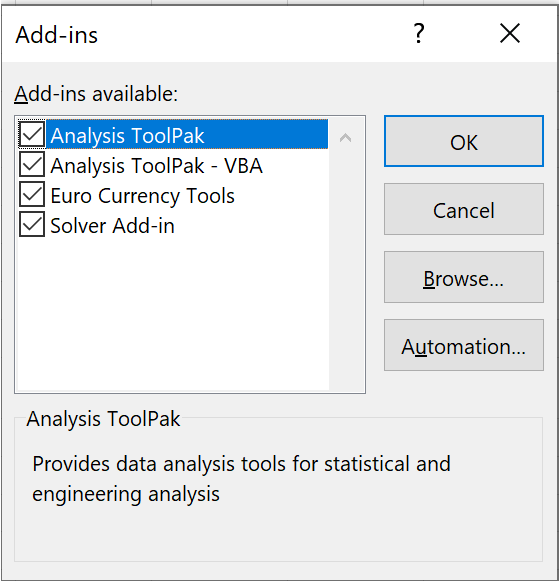 Make sure all add-ins are checked like in the screenshot, and press OK. Now, these add-ins are available to you. You will use the Analysis Toolpak in this manual. Other add-ins are likely useful at a later time. For example, the Solver add-in allows you to solve mathematical programming models.
