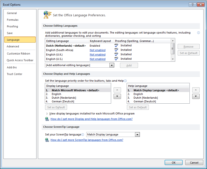 If you do not see the language of your preference in this list, you may add languages via the Microsoft Office Language Preferences (In Dutch: “Taalvoorkeuren voor Office’), which you can find in the Windows start menu. In some cases, your Office license only allows you to use one language.