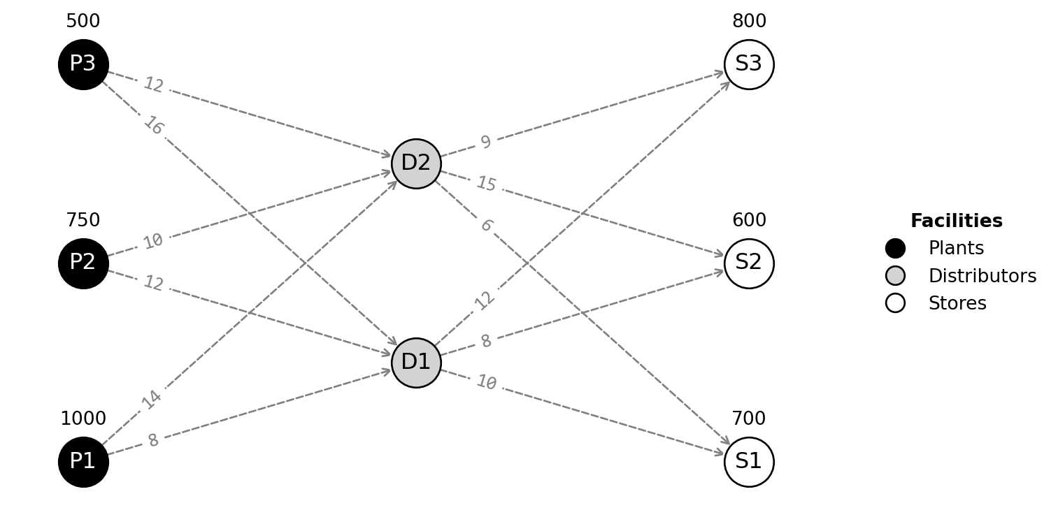 - Production limit at plants: \(\sum_{j=1}^{2} x_{i,j} \leq p_i \quad \forall i\)
