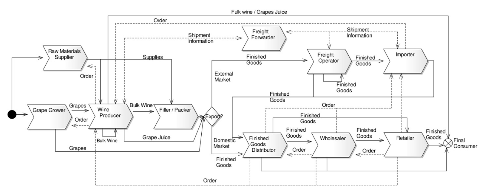 Check the supply chain presented in Figure 1 from in (Garcia, Fernanda A., et al. “A framework for measuring logistics performance in the wine industry.” International Journal of Production Economics 135.1 (2012): 284-298). Link on Canvas.
