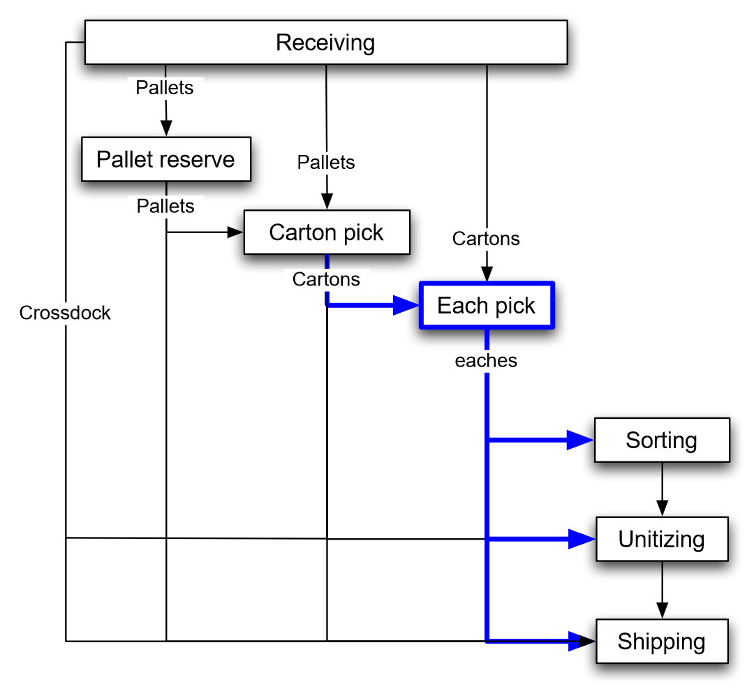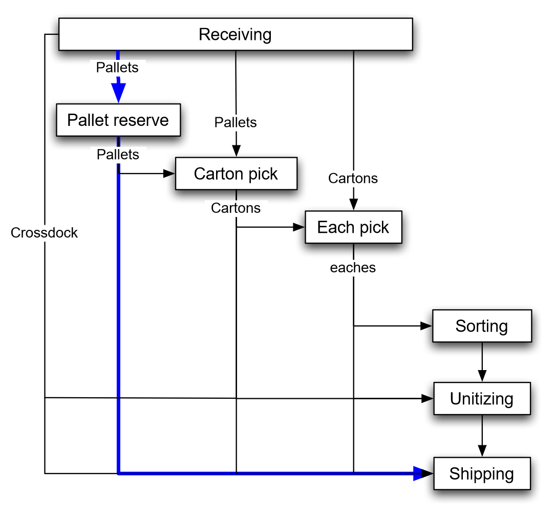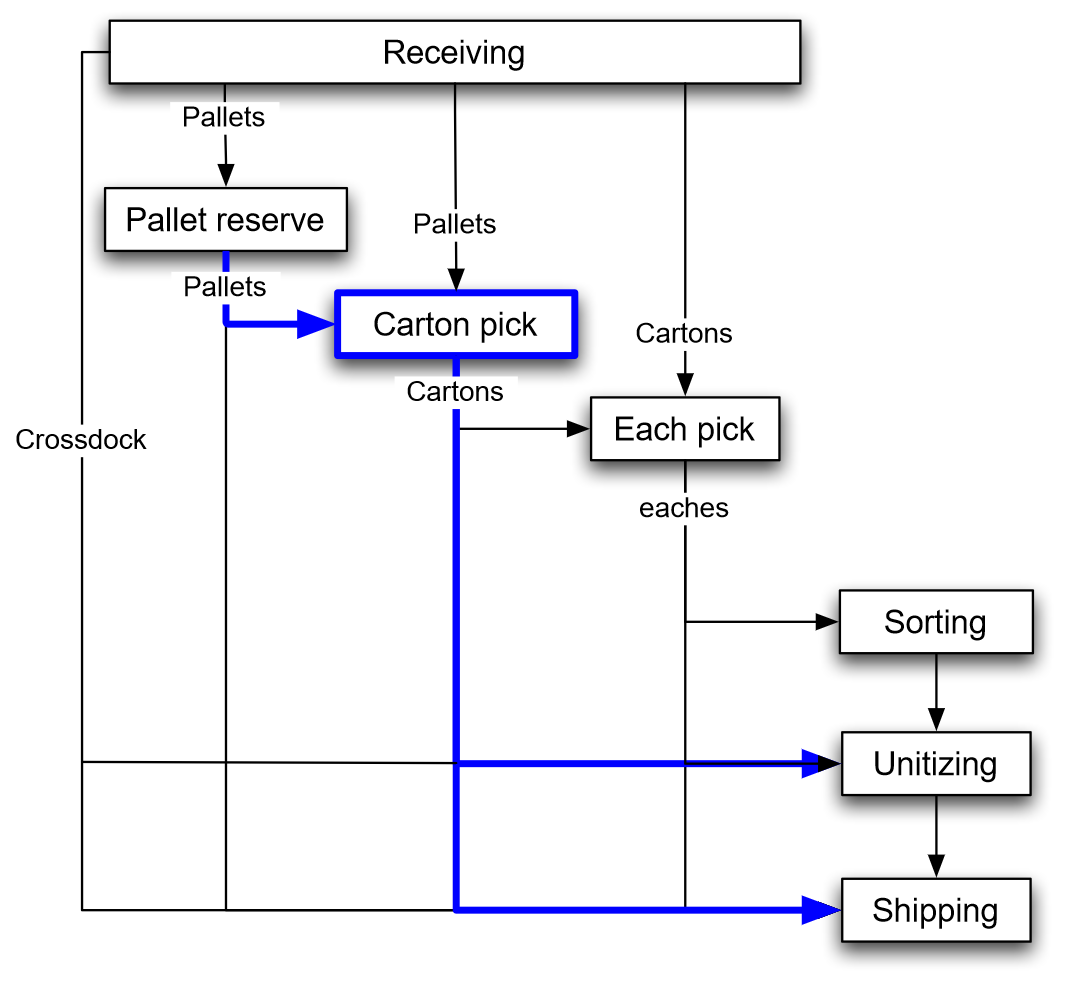 Figure 7.2 illustrates the flow of unit-loads, cartons, and products through a warehouse: